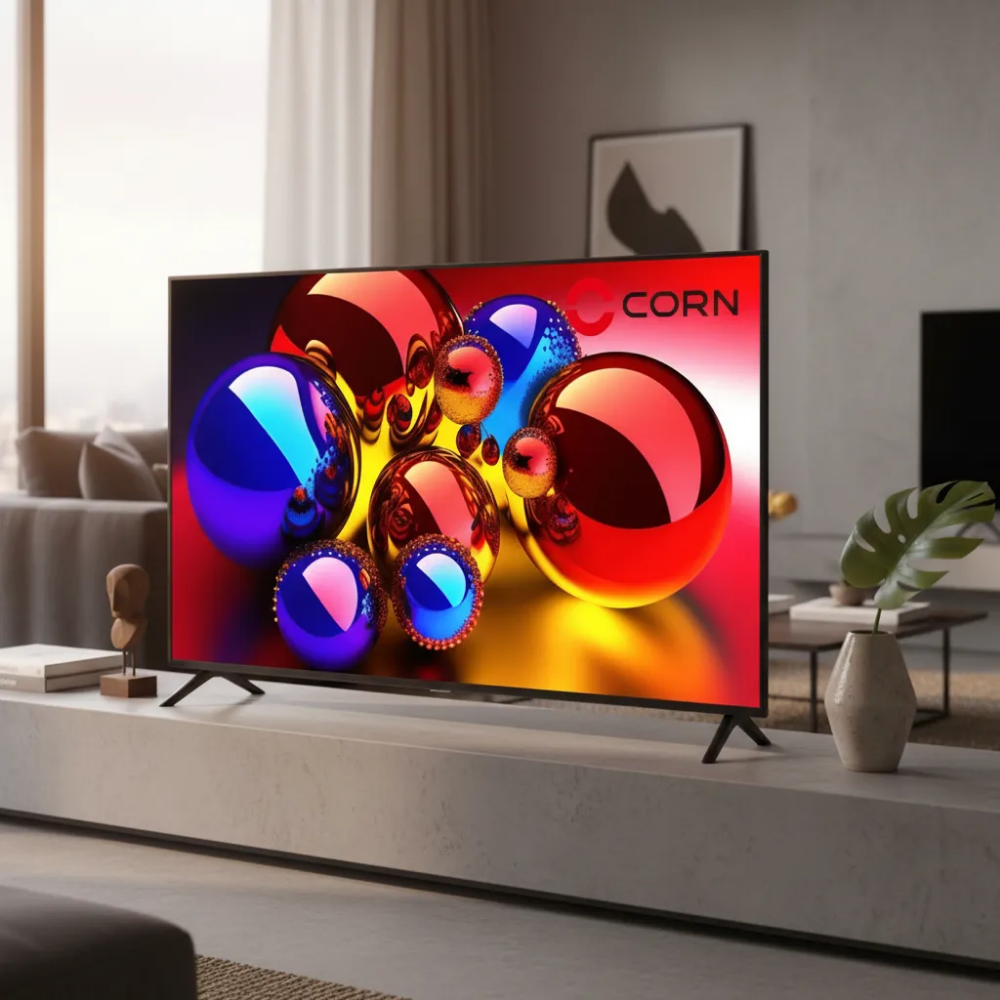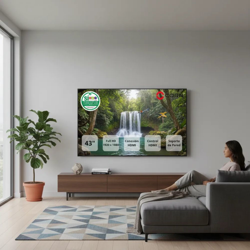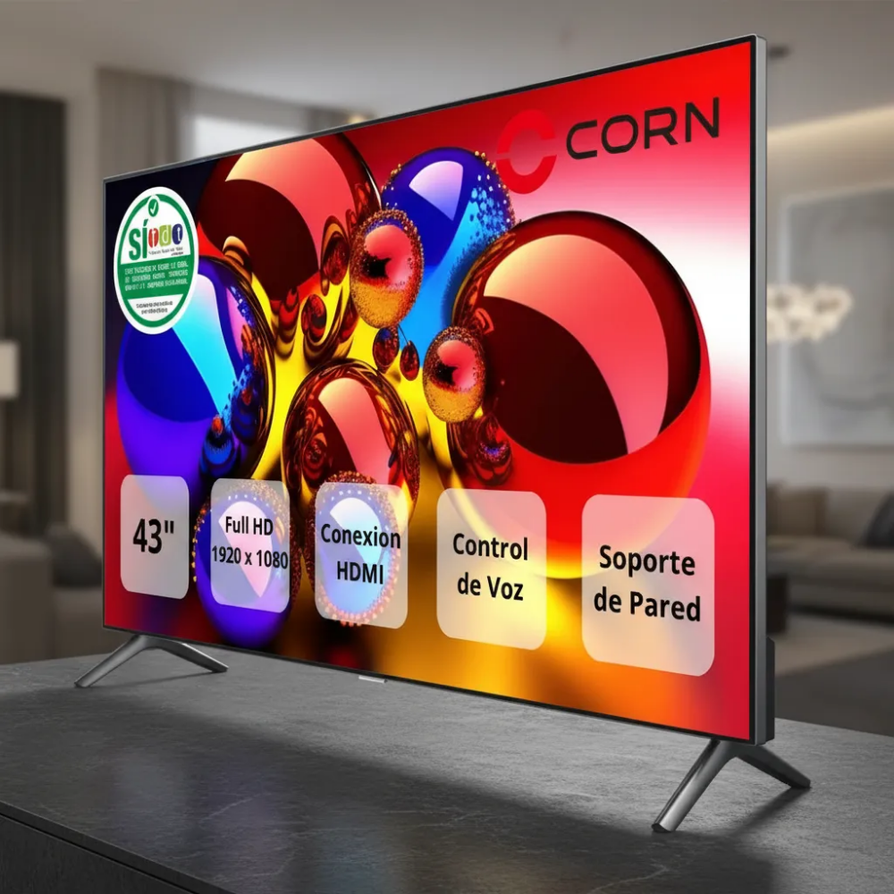 Corn 43″ Smart TV – El poder de tu voz en alta definición. Disfruta de una pantalla Full HD de gran formato con control de voz incorporado para una navegación más rápida. Accede a Netflix, Disney+ y Prime Video con un solo comando. Con Bluetooth, 3 puertos HDMI y un diseño ultra delgado de solo 6.5 cm de profundidad, es el equilibrio perfecto entre elegancia y tecnología avanzada.